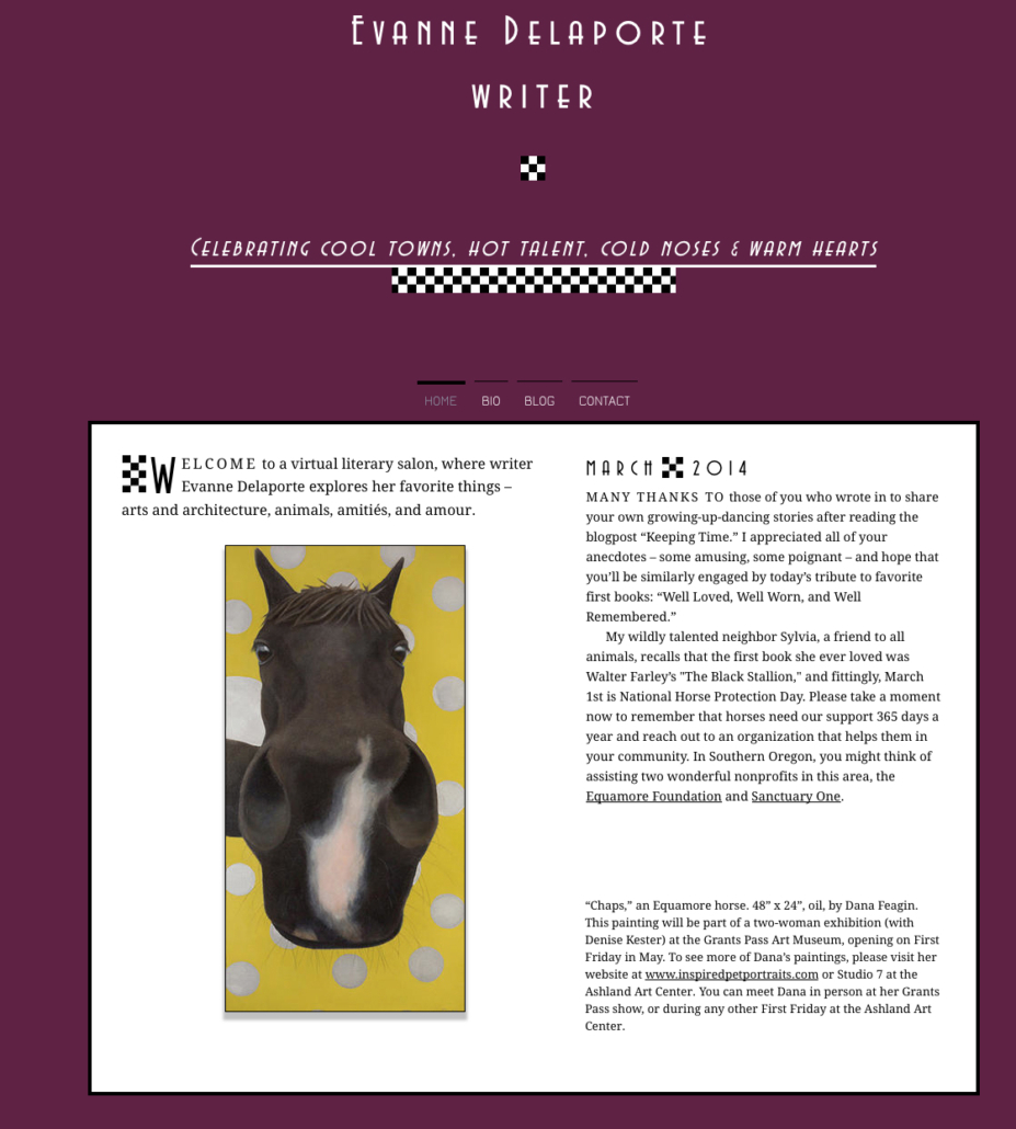 A writer friend, Evanne Delaporte, posted this image of Chaps, from Equamore Horse Sanctuary here in Ashland, on her website for the month of March, and I am now just finding time to post it! This is the year of the Horse, and National Horse Protection Day was on March 1st. Evanne just started a new blog – be sure to take a look. Chaps may no longer be on the first page, but something else of interest will be! http://www.evannedelaporte.com.